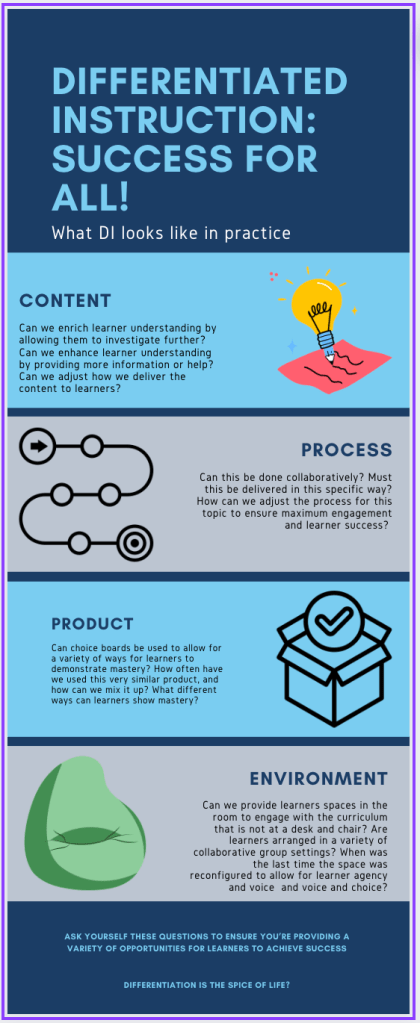 While Tomlinson (1999) came before the surge in technology, her merit for understanding differentiation is still important for the learning environment. Ultimately, differentiation is the focal point of successful instruction. Incorporating technology to differentiate instruction and provide personalized learning opportunities is one such way. Our learners today are “digital natives” (Weinstein, 2016). This means we need to create opportunities for learners to utilize technology when participating in authentic learning opportunities. For some of us, we grew up in a time when social media didn’t come out until we were in college (or after it), and we used the card catalog and actual books to complete our research. My niece, who was three at the time, grabbed my hand once (I thought to hold it) so that she could get my fingerprint to open my phone. These are today’s learners, and we need to arm them with the tools they need to succeed and teach them how to navigate these tools and use them correctly. While AI and ChatGPT can be great resources, shame on us if we do not teach learners to use them as a resource and not the ultimate solution. Also, we need to know how to detect when learners are using it as the ultimate solution and redirect and coach learners through this. Using technology to allow for differentiation and for learners to engage in their learning is paramount. However, it is important to remember that there is a time and place for technology. Learners still need to work collaboratively and interact with their peers. They need real-life face time even more than they need screen time. Creating an environment rich in differentiated materials and content will lead to an environment rich in engagement.