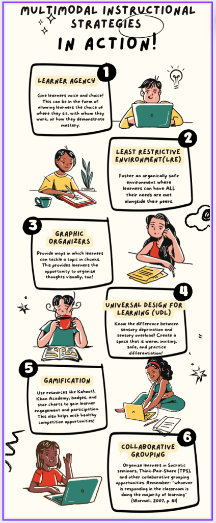 I did a mixed-methods study on using multimodal instructional strategies in the classroom. I used ten high school educators from different schools and states to gather the data. These educators were given an anonymous survey with eight Likert-scale questions and four open-ended questions. Multimodal instructional strategies are research-based best practices that need to exist in the learning environment to accommodate and engage every learner. Unfortunately, what I learned is that aside from graphic organizers and collaborative grouping, very few other multimodal strategies were incorporated at the high school level. Strategies such as gamification (Kahoot!, Khan Academy, etc.), learner agency, Socratic seminars, and Universal Design for Learning (UDL) were either not used at all, or unknown. Learners, regardless of age or grade level, benefit from these research-based strategies. If you’re not using them, please start!